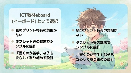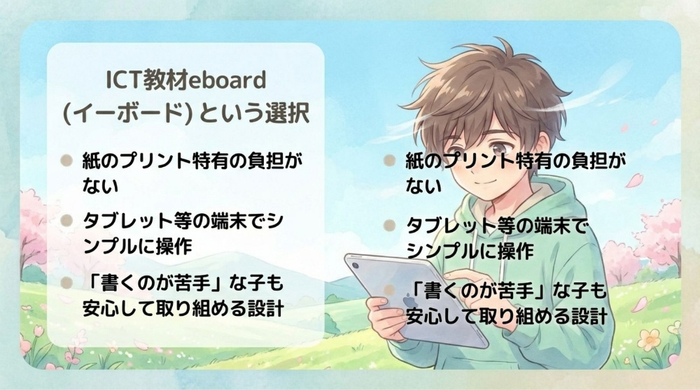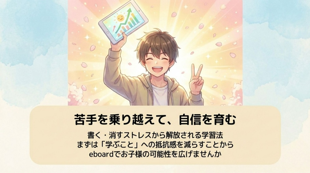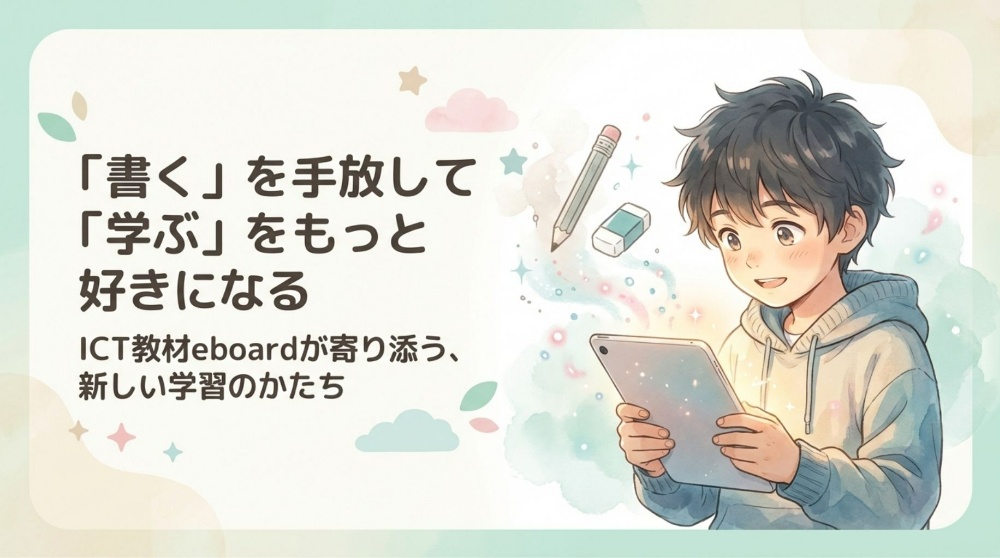 ICT教材「eboard」なら、タブレットでサクサク学習。消しゴムを使わないから、間違えても何度でも前向きに挑戦できます。