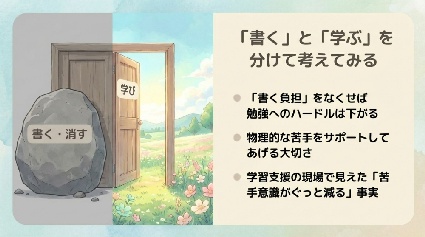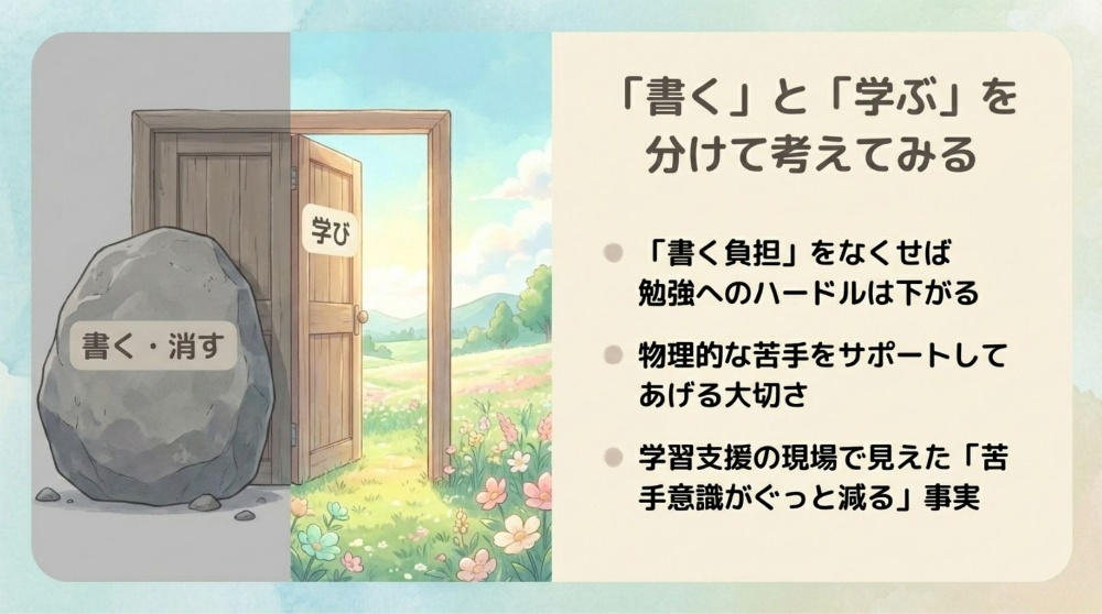 『書くこと』に力を使い果たし、考える余力が無くなったり、せっかく『書くこと』をがんばったのに、間違えたら今度は消しゴムで消さなければいけません。