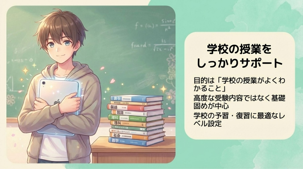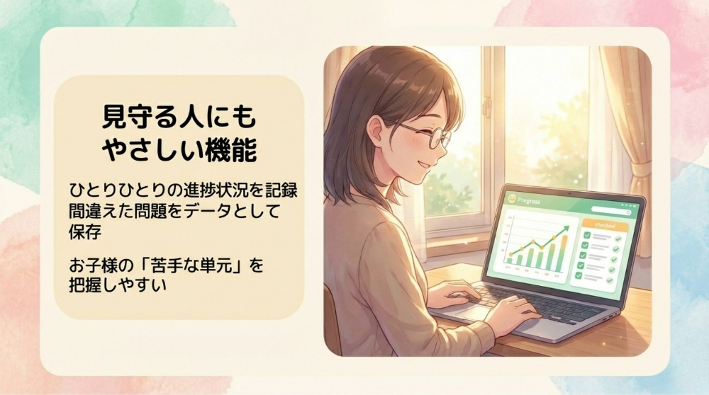 タブレット操作中心なので、書くのが苦手な子もサクサク進めます。間違えても何度でもやり直せるため、自己肯定感を育みながら基礎を固められます。